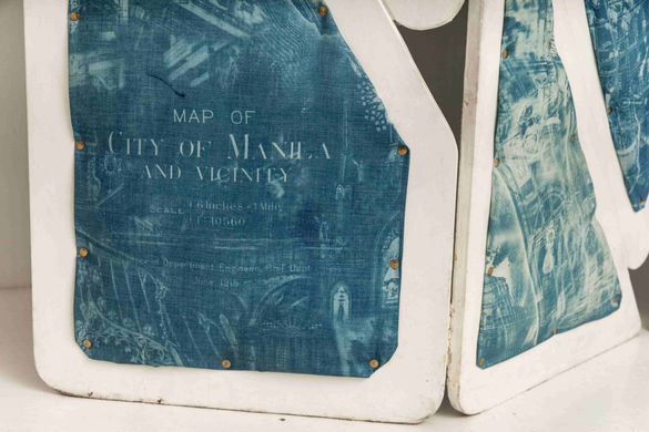 Specters of Survival reflects on the layered histories of Manila, merging archival mapping, colonial architecture, and traditional garments to explore the persistence of memory, faith, and cultural identity. The work features a 1915 map of Manila overlaid with cyanotype prints of significant churches photographed in 2019—structures that have withstood the passage of time, including Malate Church, San Sebastian Church, San Agustin Church, Manila Cathedral, Sta. Ana Church, Paco Church, San Vicente de Paul Parish, and Loreto Parish.